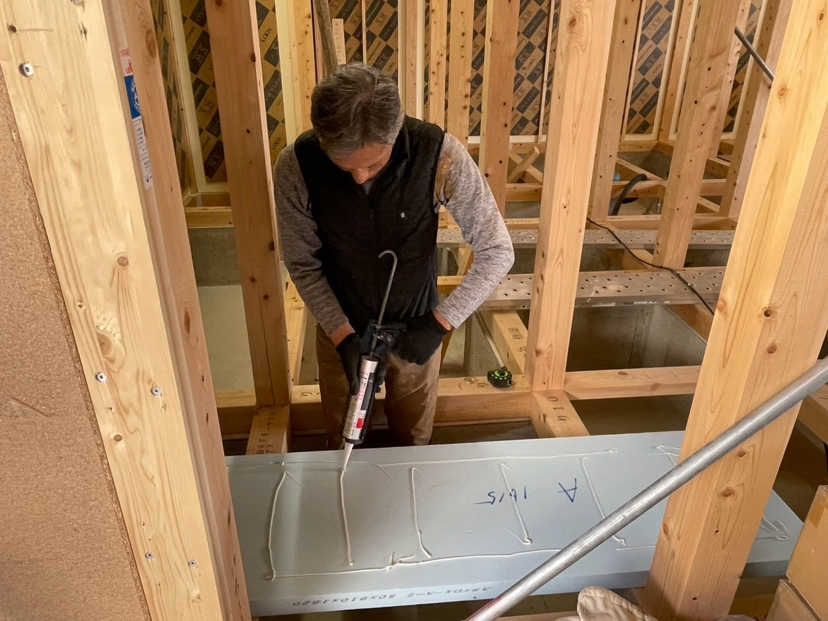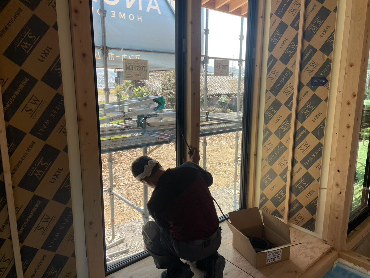 窓廻りの気密処理、防水処理をしっかりしたあとに窓を取り付けていきます。