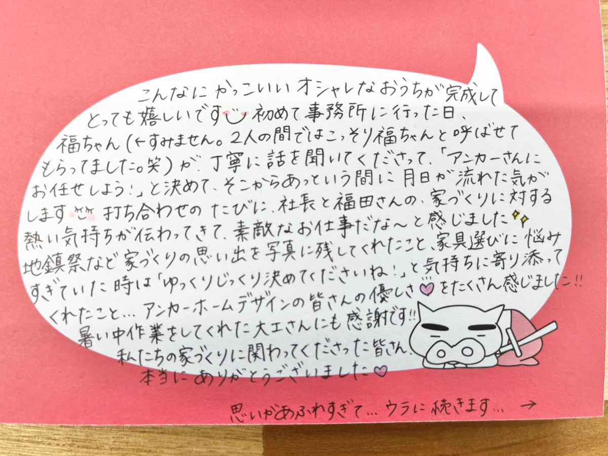 初めてお会いした日に、D様から「アンカーさんの完成見学会のチラシがポストに入っているのをずっと見ていて、素敵なお家を建てられているなと思っていました。お家を建てるときは、アンカーさんにお願いしたいと思っていたんです!」