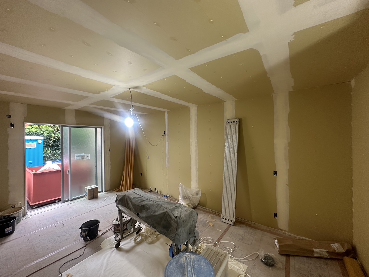 BLOGブログ 藤本 07/18(金) 宇和島市N様邸の内装工事が始まりました! こんにちは!こんばんは!おはようございます! 営業設計の藤本です。 宇和島市桝形町のN様邸現場では、ついに足場が解体されました。 内部では、大工さんから内装業者さんにバトンが渡されました! まずは、ボードの継ぎ目やビス頭のくぼみをパテで平滑に整えていきます。 高天井の部分は室内に足場を組み、作業をしていきます。 クロスが貼られると、俄然家っぽくなってきましたね! 自然光の反射だけでも室内が明るく感じられます。 N様、お引越しが楽しみですね! PREV NEXT 一覧へ戻る