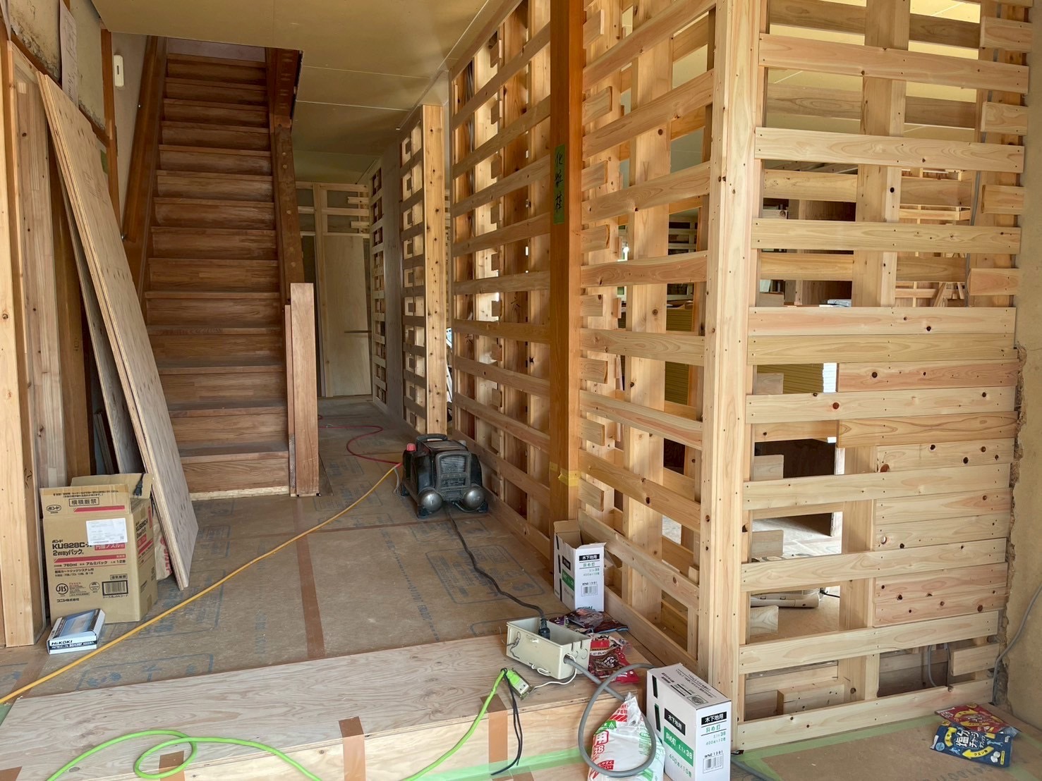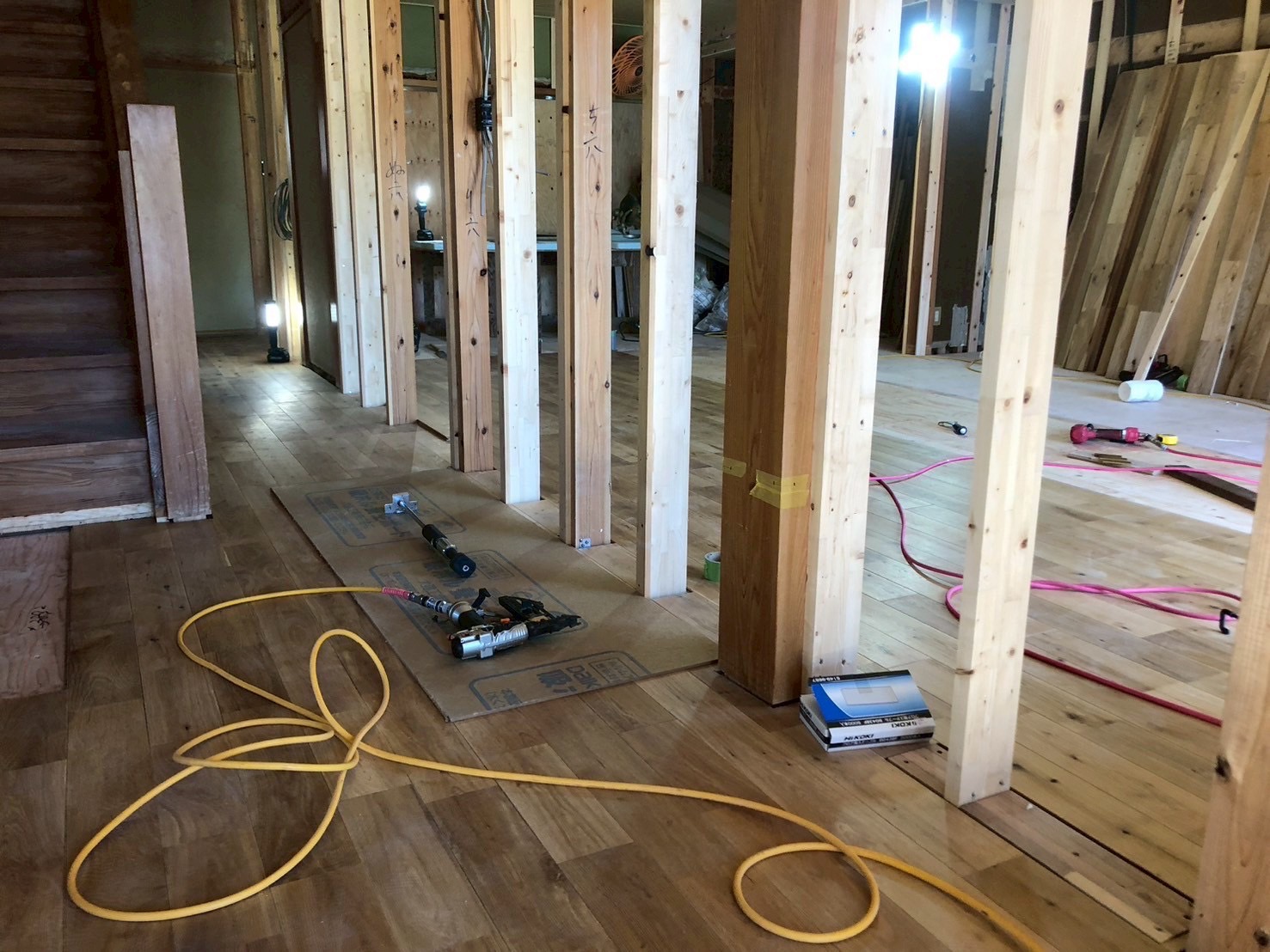 BLOGブログ 赤松 09/04(木) 愛南町K様邸は床貼りと壁の工事をしております! アンカーホームデザインの赤松流空です。 愛南町K様邸では、天井のボード貼りが終わり、床貼り、そして壁の下地を入れております! 新築住宅同様のオークの無垢材を敷いていきます。 床を貼り終えると、壁のボードを貼る為の下地を作っていきます。 あとは、壁のボードを貼り終えると、とうとう大工工事が完了します! PREV NEXT 一覧へ戻る