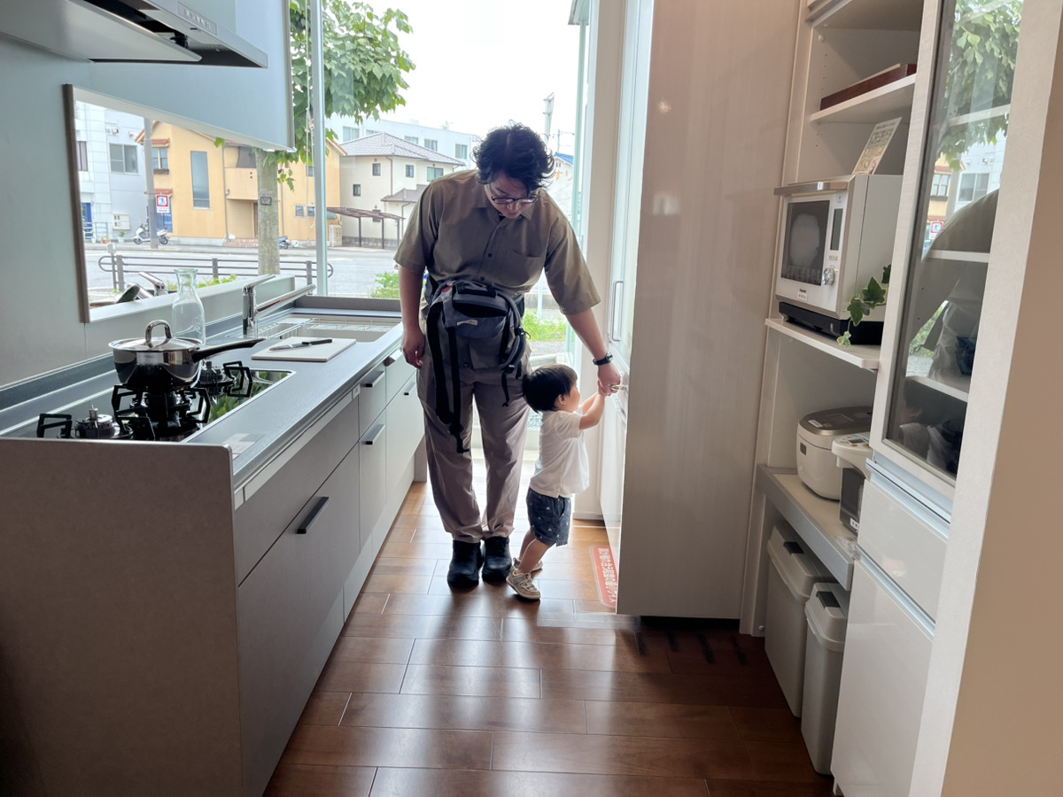 お父さんを見つけて、一緒にキッチンの仕様、色の確認をしたり♪