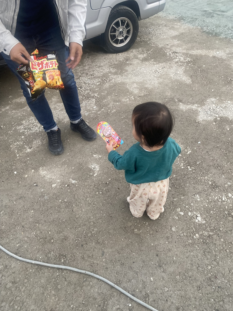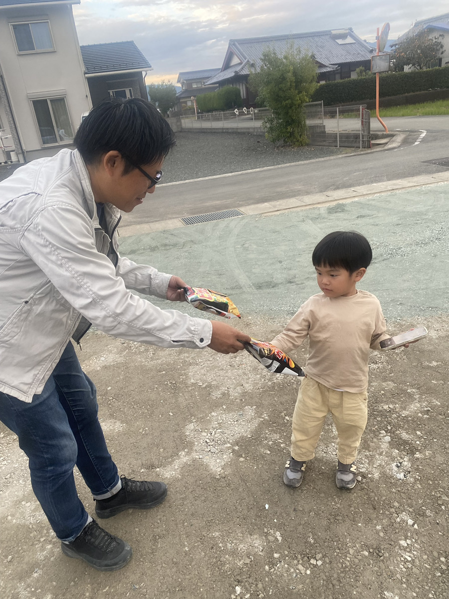 現場確認が終わりましたので、お子様たちにお菓子の差し入れのを差しあげました!