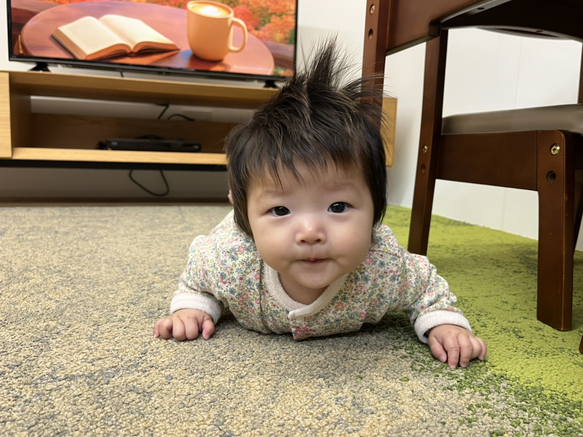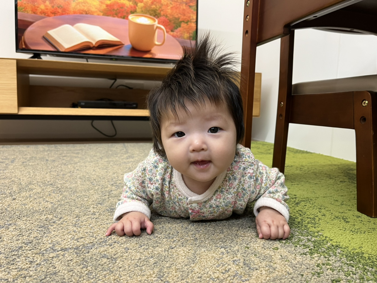 妹ちゃん、しっかり寝て、目が覚めると、キッズルームに寝ころびご機嫌です♪