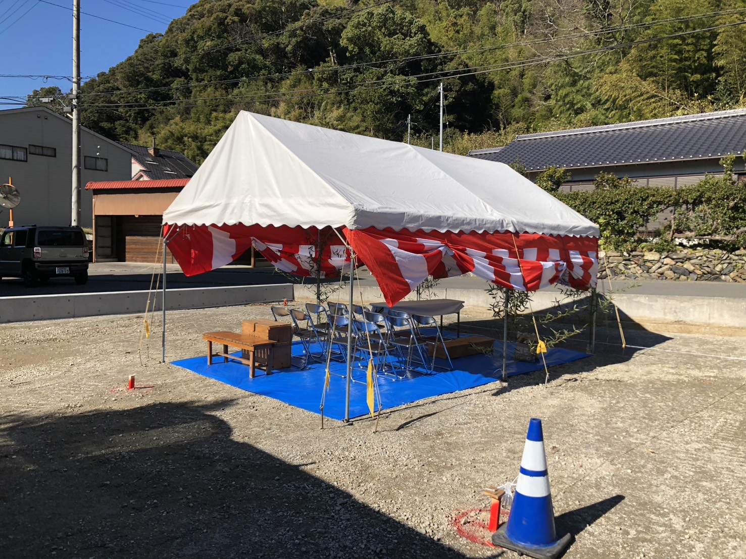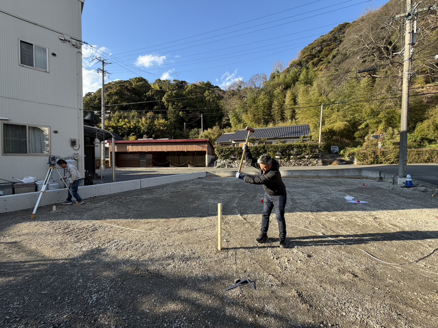 先日、宇和島市野川にて今月から着工予定のN様邸の丁張り(建物の位置出し)を行いました!