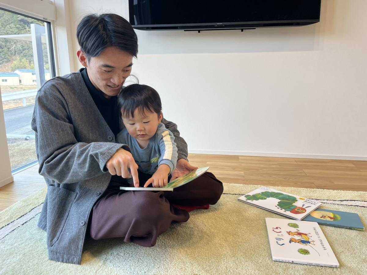 自分のおもちゃの収納場所からおもちゃや本を取り出しては、お父さんと一緒に良い子で遊んでくれていました!
