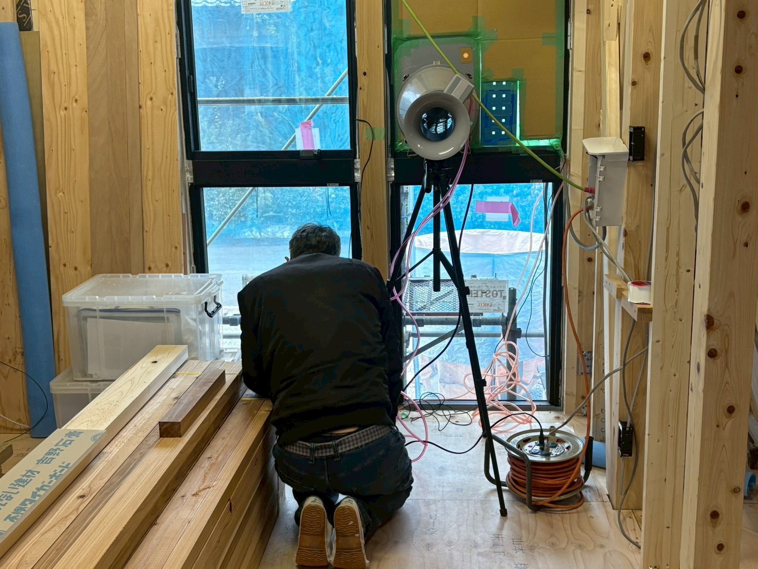 外部では、防水シートが貼り終わった頃、気密測定を行いました!