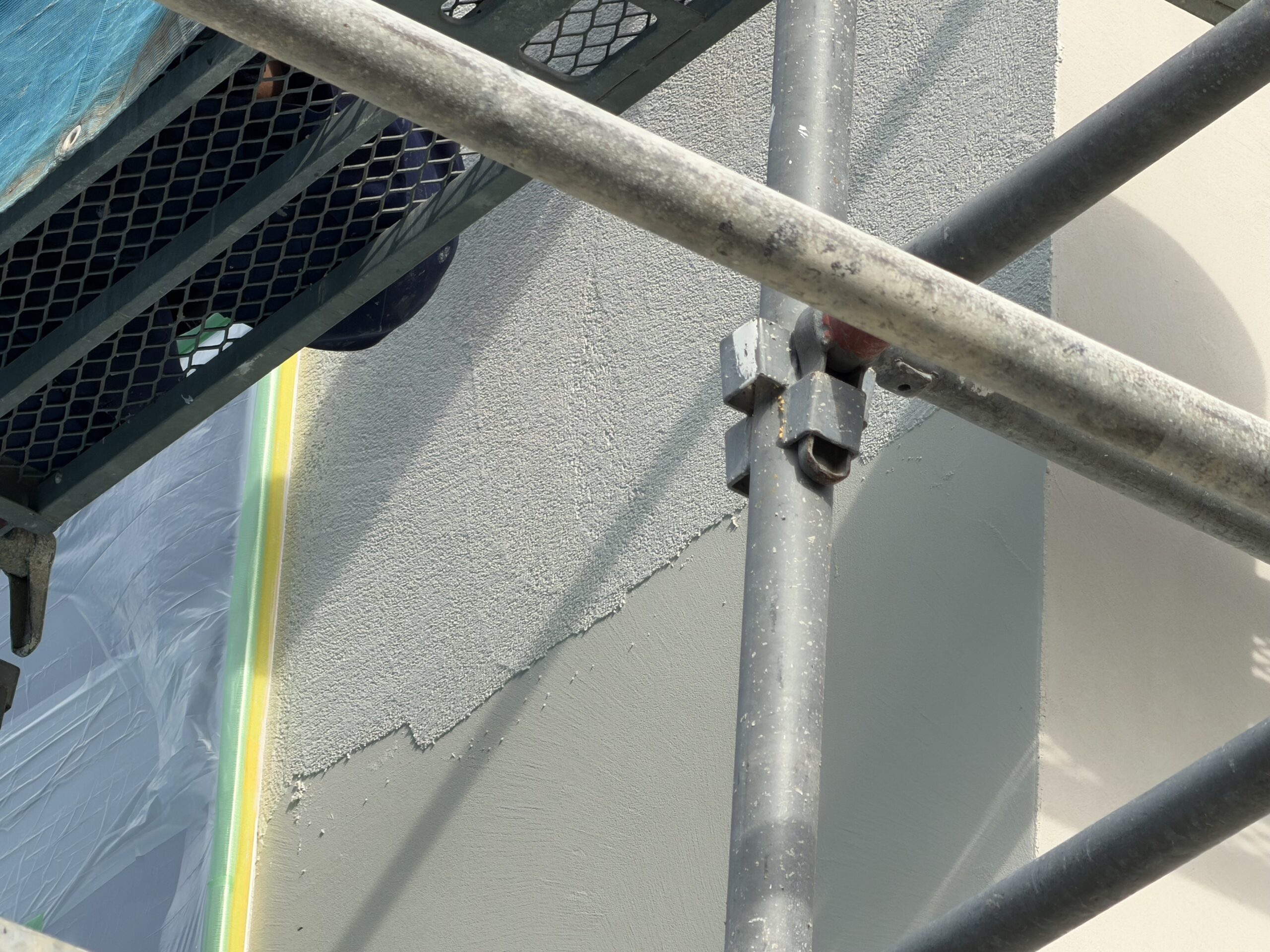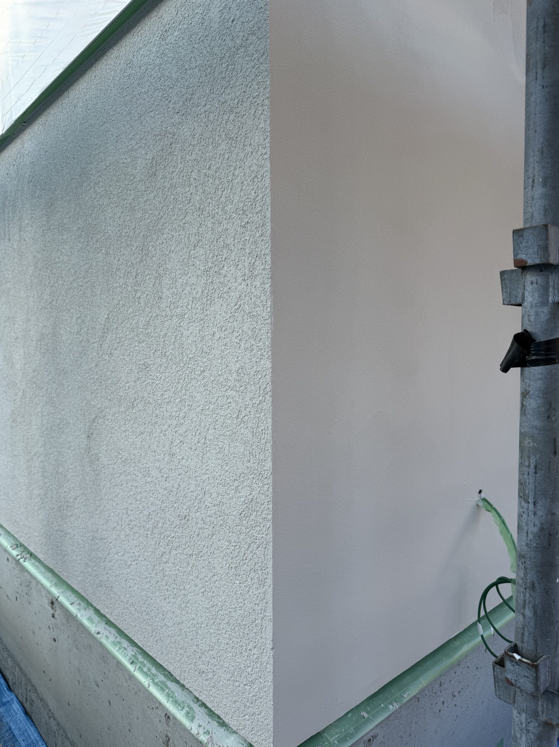 1階部分が下地調整材の状態、2階部分が上塗りをかけた状態です!