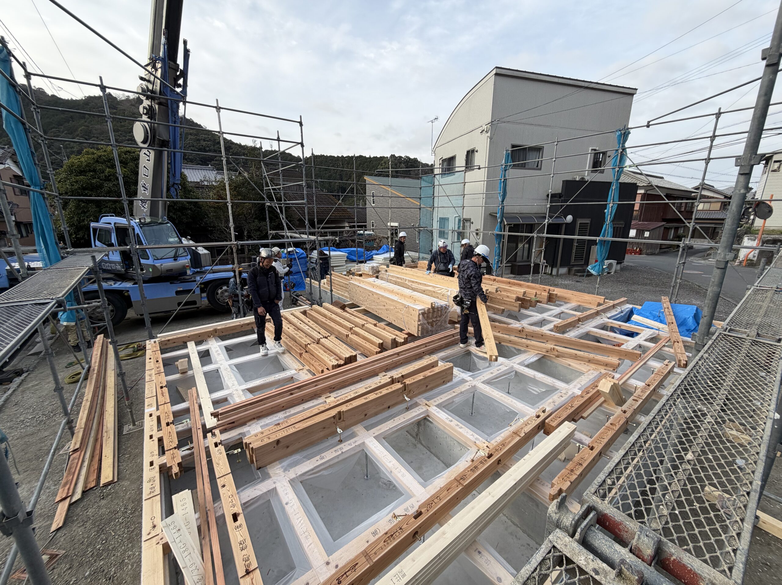 上棟先日までに柱・梁等の事前スタンバイを済ませてもらっていたので、スムーズな導入です。