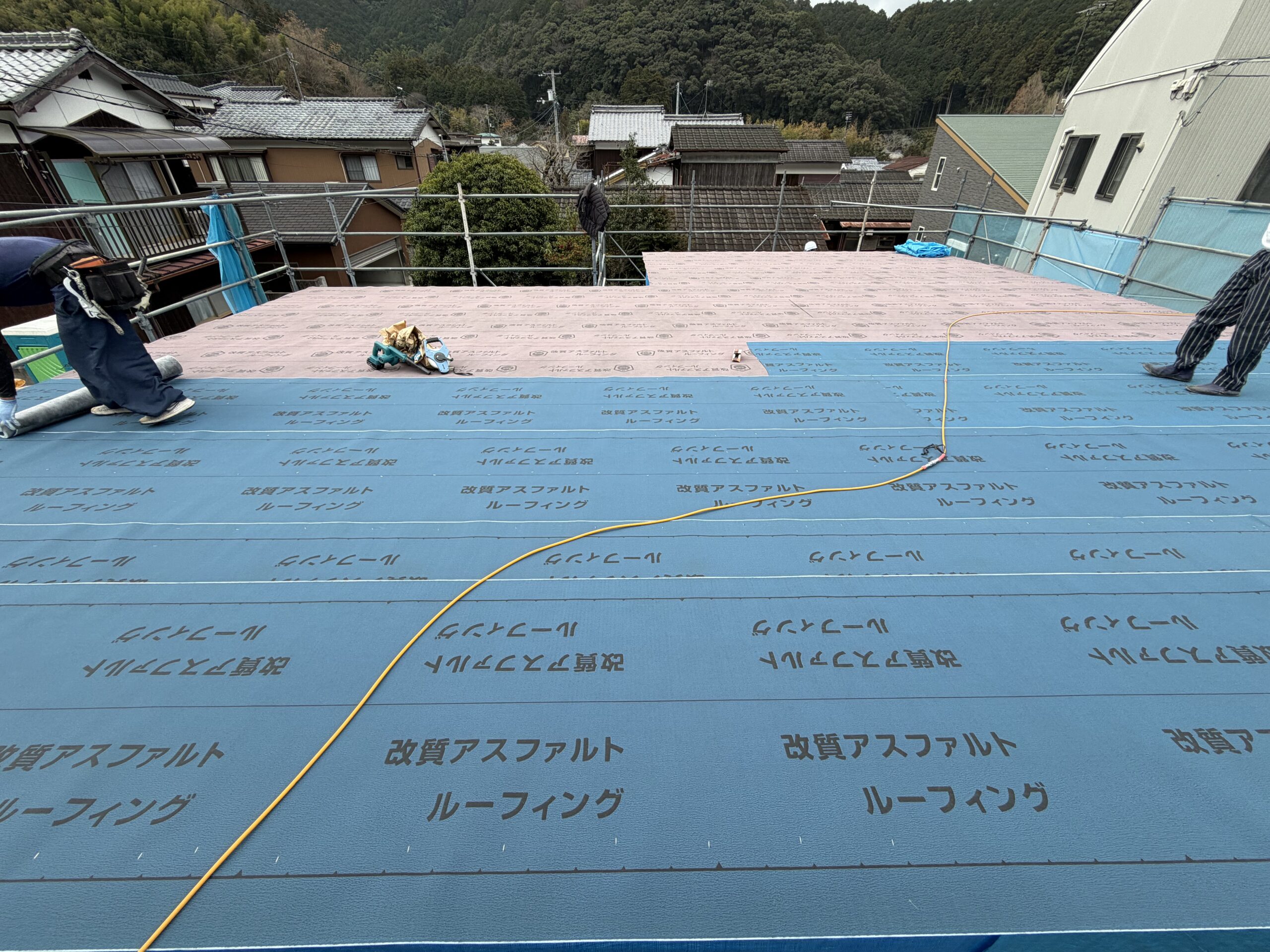 屋根上のルーフィングシート作業と並行して、