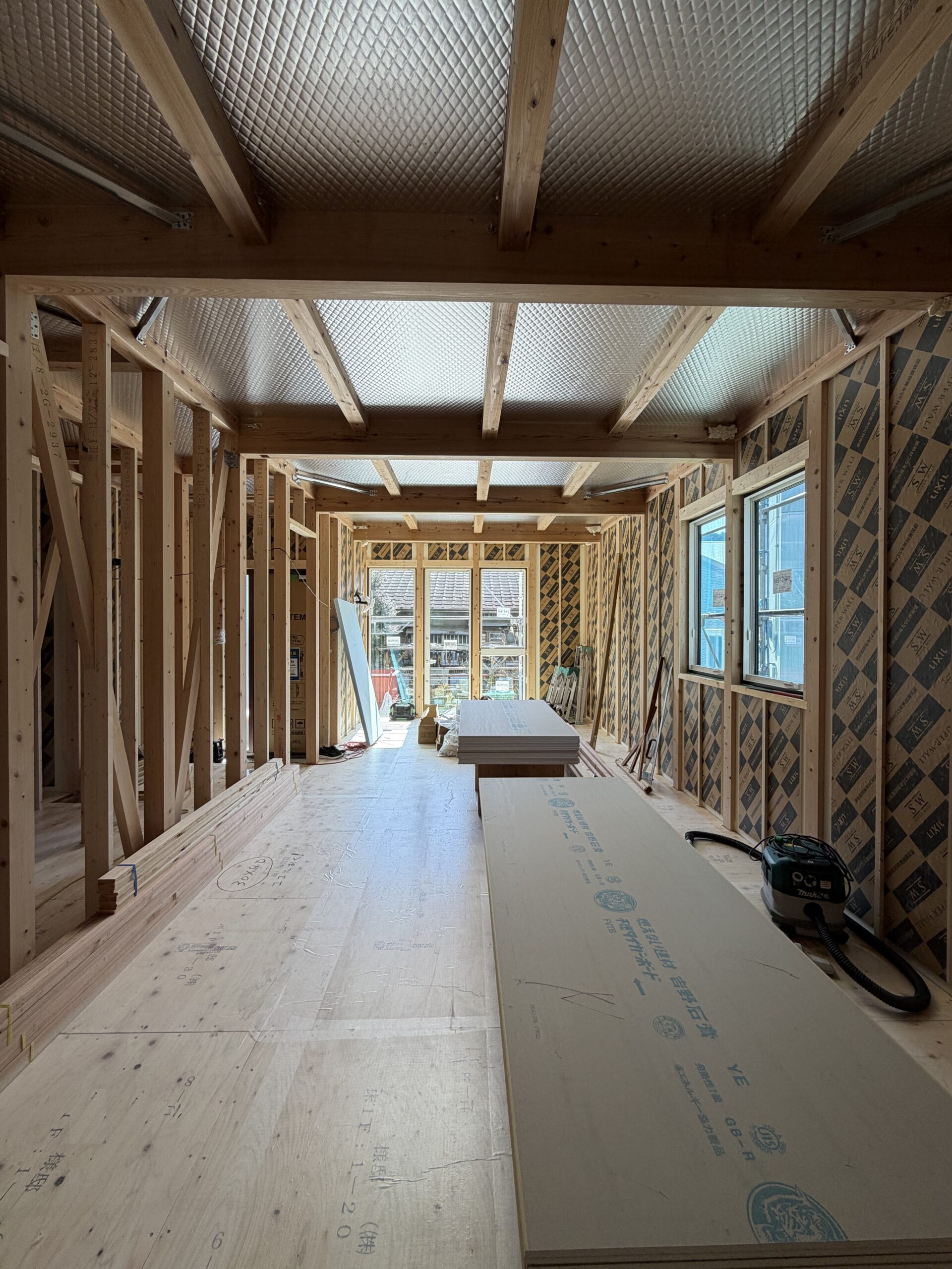 構造用合板の上から、銀色の「透湿・防水・遮熱シート」を貼り終えました!